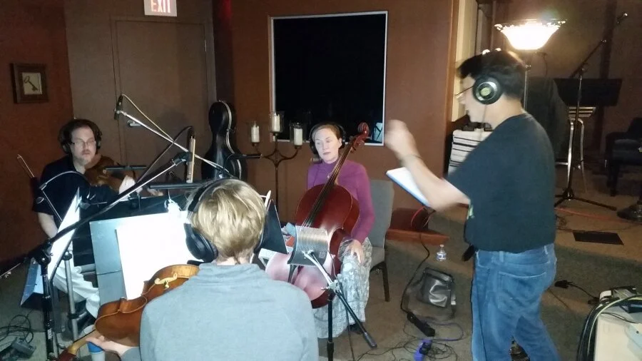 The next layer was recording the string quartet parts for several of the songs. I had to write out parts for everyone within a period of a few days, but thankfully the musicians we hired were more than capable of sight reading beautifully. Maurice played the first violin parts, and will be featured on some additional solo violin layers which we'll record and mix in later. Here are some videos showing the process of rehearsing and recording the string quartet parts for the album: